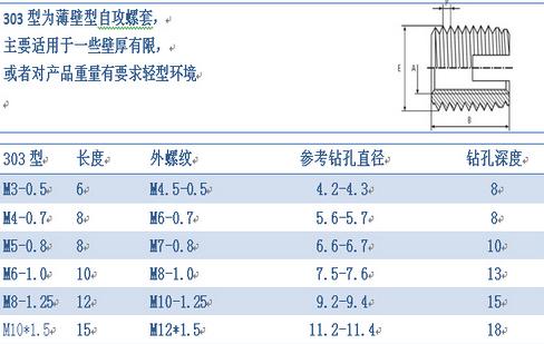 24h咨询热线13069364703 薄壁型厦门自攻螺套外观上看主要有两种区分,一种是一端开槽型的,另一种是一端三圆孔型的,其中开圆孔型的又分为307型和308型两种,307型和308型外观主要区别就是同一直径下,长度和外径大小有所区分。以上各种型式螺套均具有自行攻牙功能。