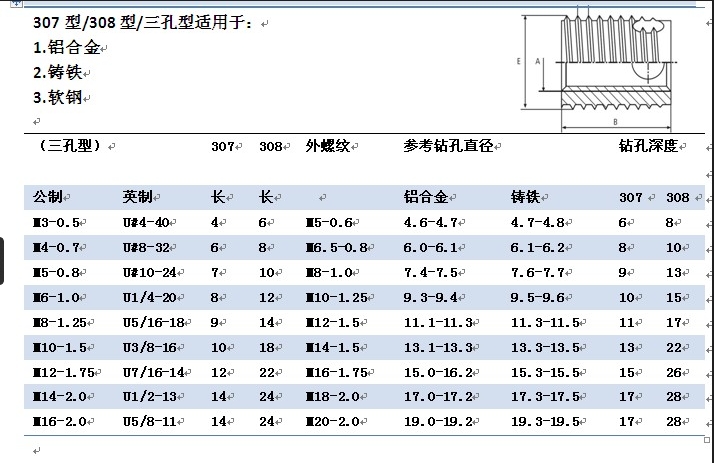 1.在相应的螺纹底孔直径范围内进行底孔钻孔加工。 配套材料硬度较大时,请在该范围内钻稍大一些的底孔。
